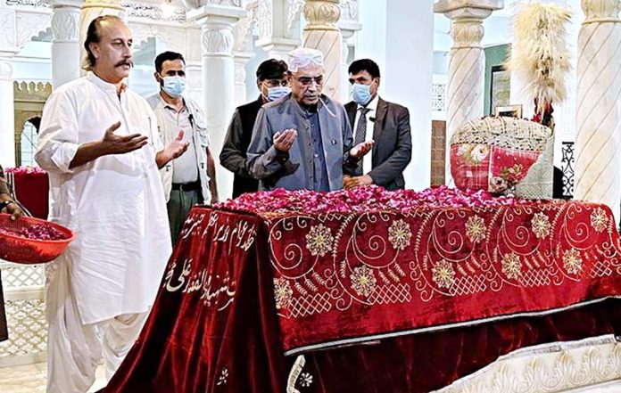 Asif Ali Zardari visited the grave of former prime minister and chairperson of PPP Shaheed Mohtarma Benazir Bhutto, laid a floral wreath at the grave and offered “Fateha”.