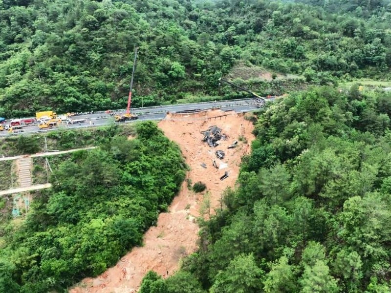 An aerial photograph published by state broadcaster CCTV showed wrecked vehicles lying in a deep muddy pit where the highway once ran.