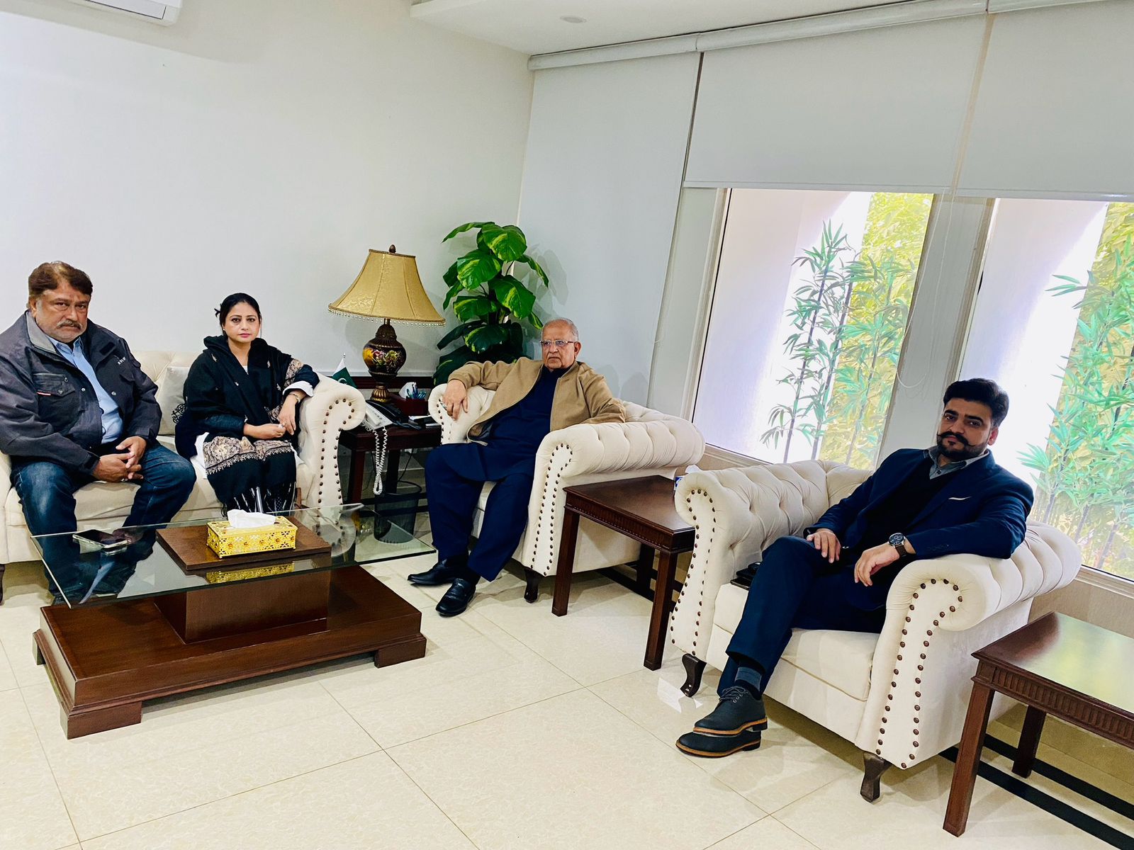 Islamabad, Pakistan: A delegation of prominent journalists, led by President of PFUJ Workers Dr. Sadia Kamal and General Secretary of RIUJ Workers Syed Bilal Izzat Naqvi, visited Federal Minister for Housing and Works, Mian Riaz Hussain Pirzada. Senior journalists Muneeb Bukhari and Rana Asif were also part of the delegation.