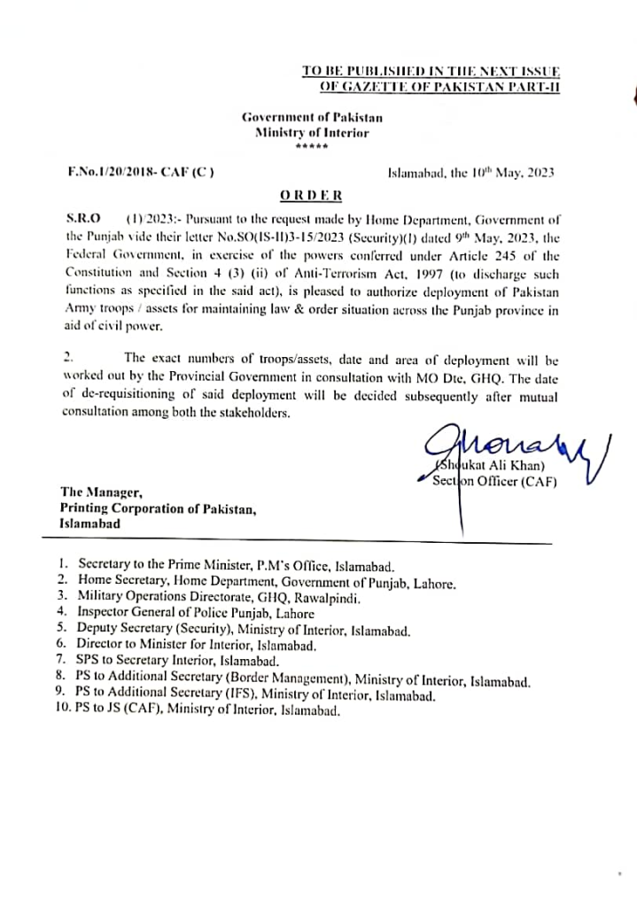 According to a notification issued by the Ministry of Interior, the army troops’ deployment has been requested under Article 245 of the Constitution and Section 4(3)(ii) of Anti Terrorism Act 1997.