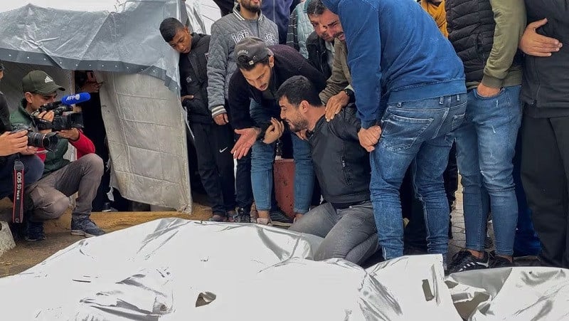 At a funeral in Gaza on Monday a line of Palestinians touched white shrouds containing the bodies of at least 70 people who Palestinian health officials said were killed by an Israeli airstrike targeting Maghazi in the centre of the besieged strip.