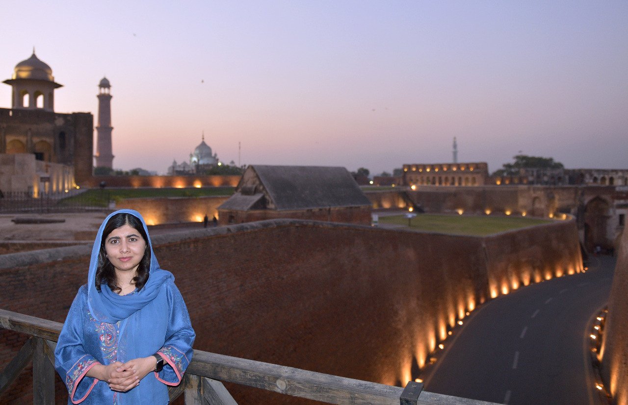 Malala Yousafzai posing in front of Lahore’s Badshahi mosque.