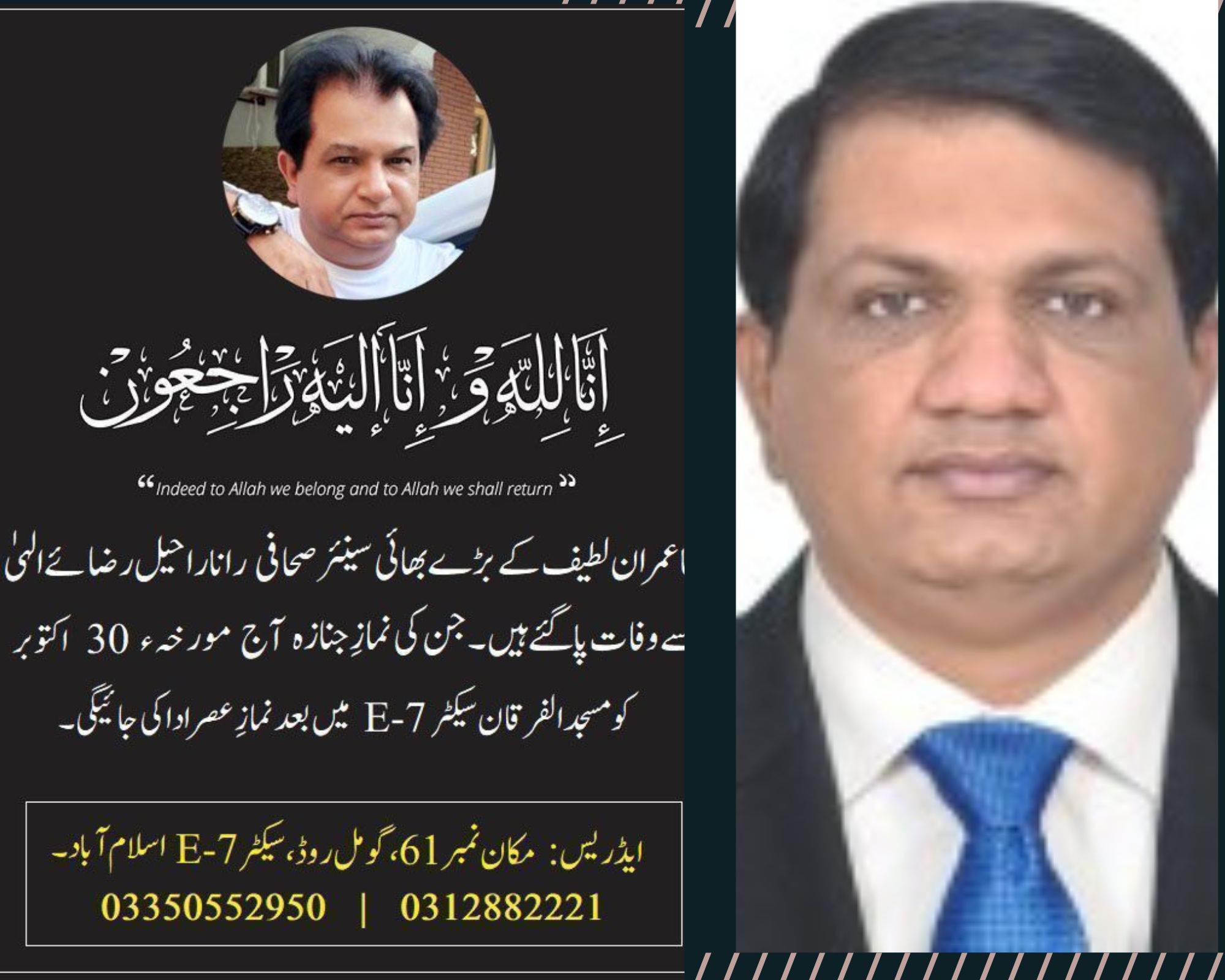 Islamabad: It is with great sadness that we report the death of Rana Raheel, elder brother of senior Investigative journalist Rana Imran Latif. Raheel died yesterday, and his funeral will be held today After Namaz e Asar 30 October 2022 at Al- Furqan Masjid Sector E7 Islamabad.