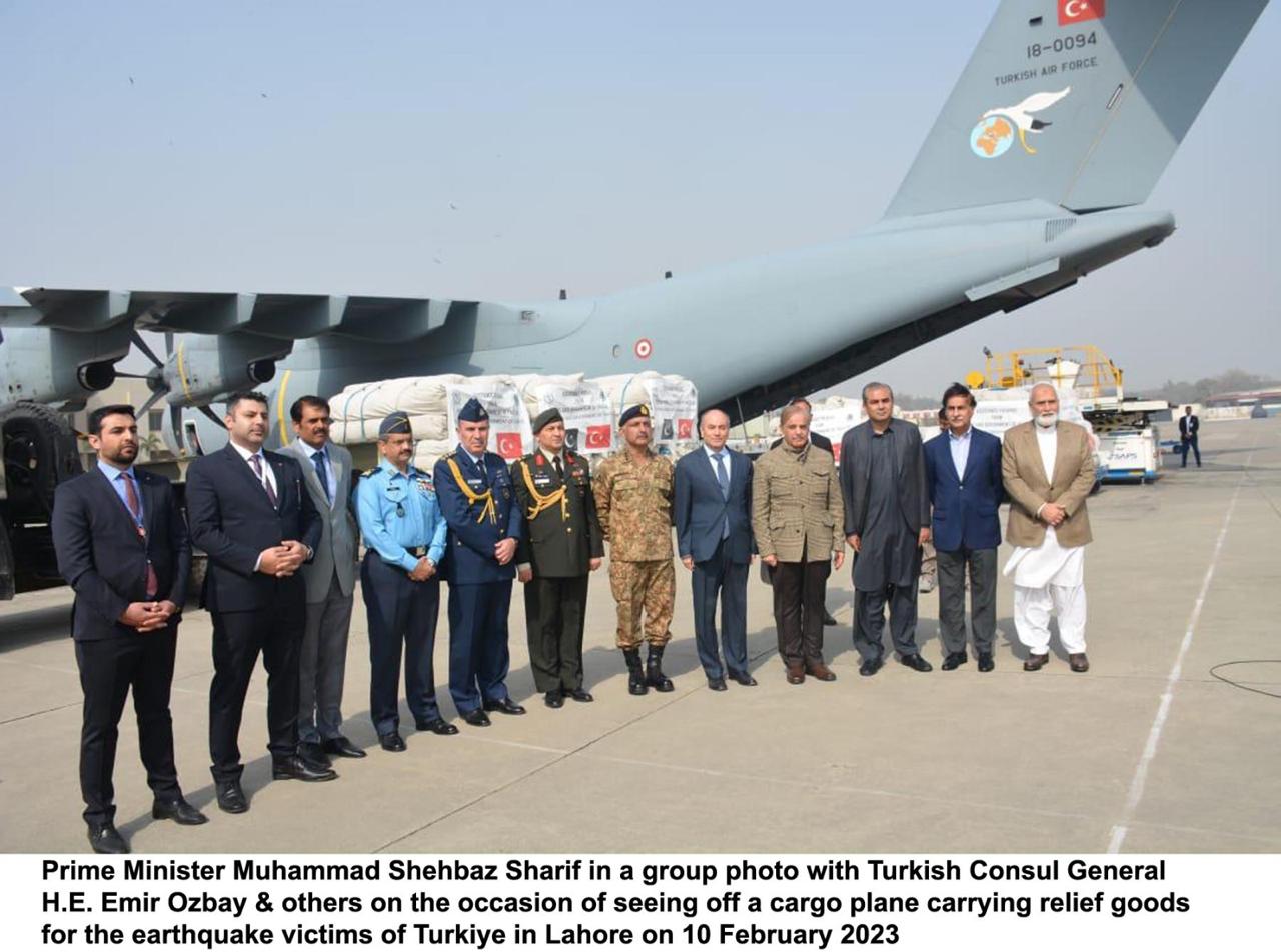 Talking to the media here at Lahore airport, the prime minister handed over 100 tonnes of relief goods including food, medicines, and winterized tents for the people of Turkiye.