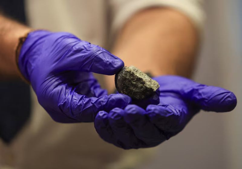 The rare meteorite fragment – black and shiny on the outside with a light grey, concrete-like interior – weighs less than 90 grams (3.2 ounces) with a diameter of less than 5 cm (2 inches) and was provisionally named the Nqweba Meteorite, after the nearby town where it was discovered.