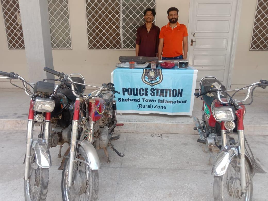 Islamabad, May 16 : In a successful operation, SHO Police Station Shahzad Town and his team arrested individuals allegedly involved in a series of motorcycle thefts. The arrest led to the recovery of seven stolen motorcycles and valuable spare parts worth millions of rupees.