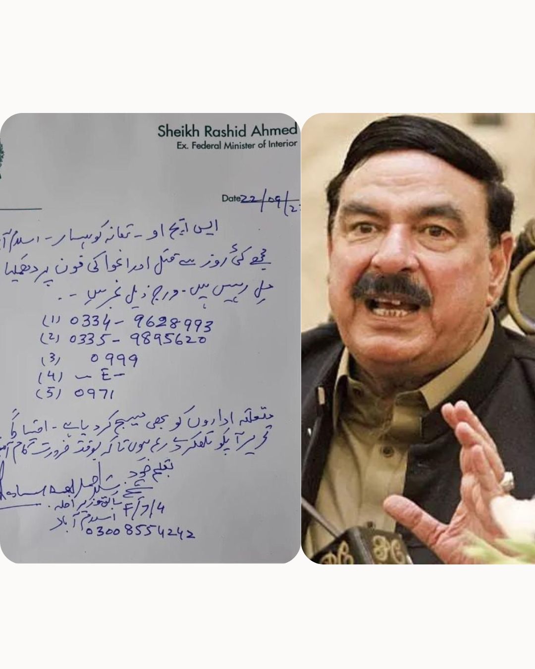 Islamabad. Former Interior minister and a political party head Sheikh Rashid Ahmed has filed a written complaint to police station kohsar islamabad, asking them to register a First Information Report (FIR) against unknown persons who are threatening him.