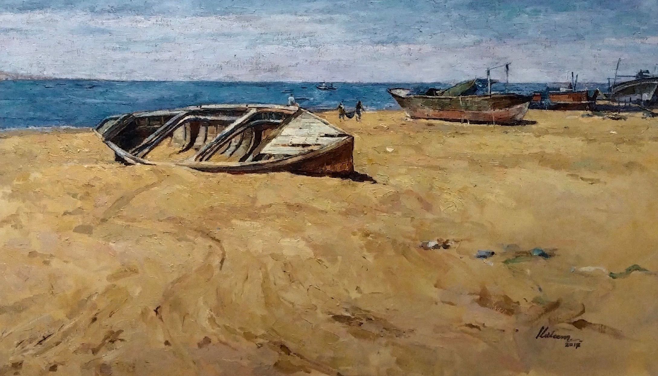 In the distance, a pale horizon settles above the cobalt depths of waves caressing the gold sands of this quiet shore. A boat leans on its side – resting, abandoned? Two men carry a burden between themselves. Do they move towards the ocean, or are they coming ashore? Do they call out to the one gazing towards the lone vessel negotiating its way on the water? Do they listen to the sound of the waves, to the gentle lapping of froth edging the beach? Can they taste the salt in the air, can they see the colour of the wind?