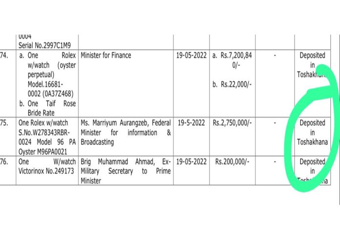 W278343RBR-0024 having model 96 PA Oyster M96PA0021 worth Rs. 2.75 million has been deposited in Toshakhana by the information minister on May 19, 2022.