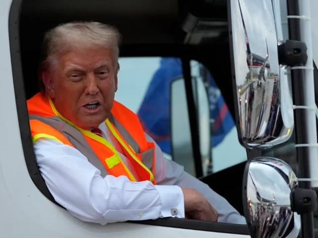 Trump, donned in an orange safety vest, sat in the passenger seat as the truck cruised around the tarmac.
